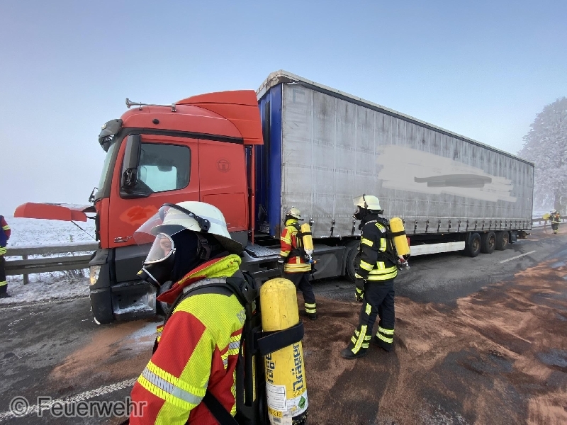 Alarmstichwort: LKW in Vollbrand. Wir waren soeben von einem vorherigen Einsatz zurückgekehrt und noch angezogen, da wurde ein brennender LKW auf der K6939 zwischen Ergenzingen und Seebronn gemeldet. Bei unserem Eintreffen war der Brand bereits gelöscht. Das Personal eines zufällig hinzugekommenen NEFs hatte den Brand unter der Fahrerkabine mit einem Feuerlöscher gelöscht. Wir kontrollierten mit der Wärmebildkamera nochmals den Bereich und kühlten ein wenig mit Wasser nach. Auslaufende Betriebsmittel mussten dennoch großflächig aufgenommen werden. Hierzu wurde die Straße vollständig gesperrt.